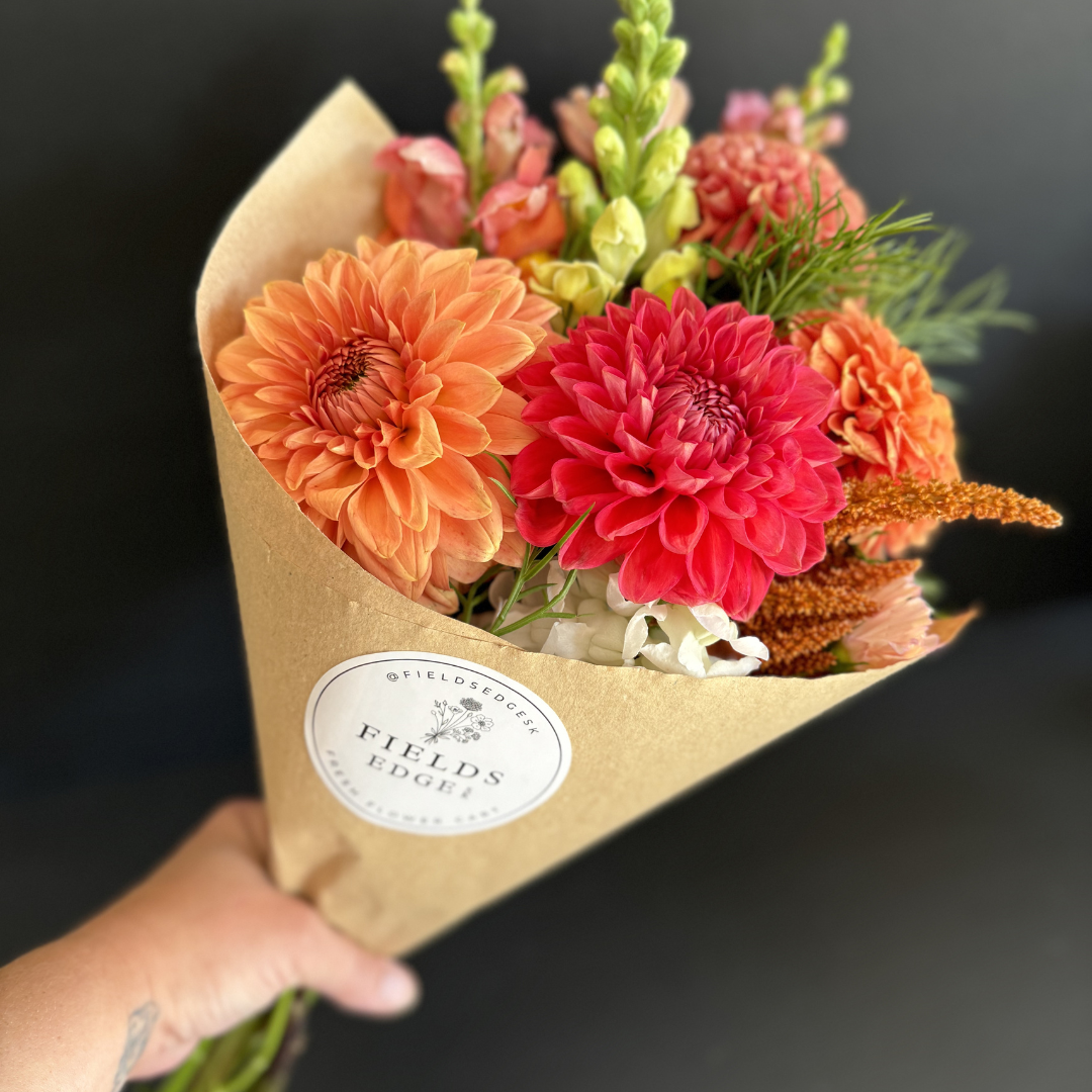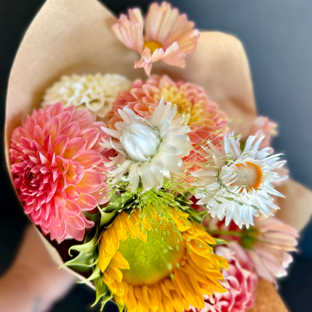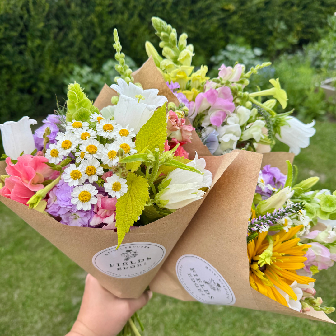 One wrapped, hand tied bunch of seasonally available fresh flowers grown locally in my garden. Approx 20 stems.
